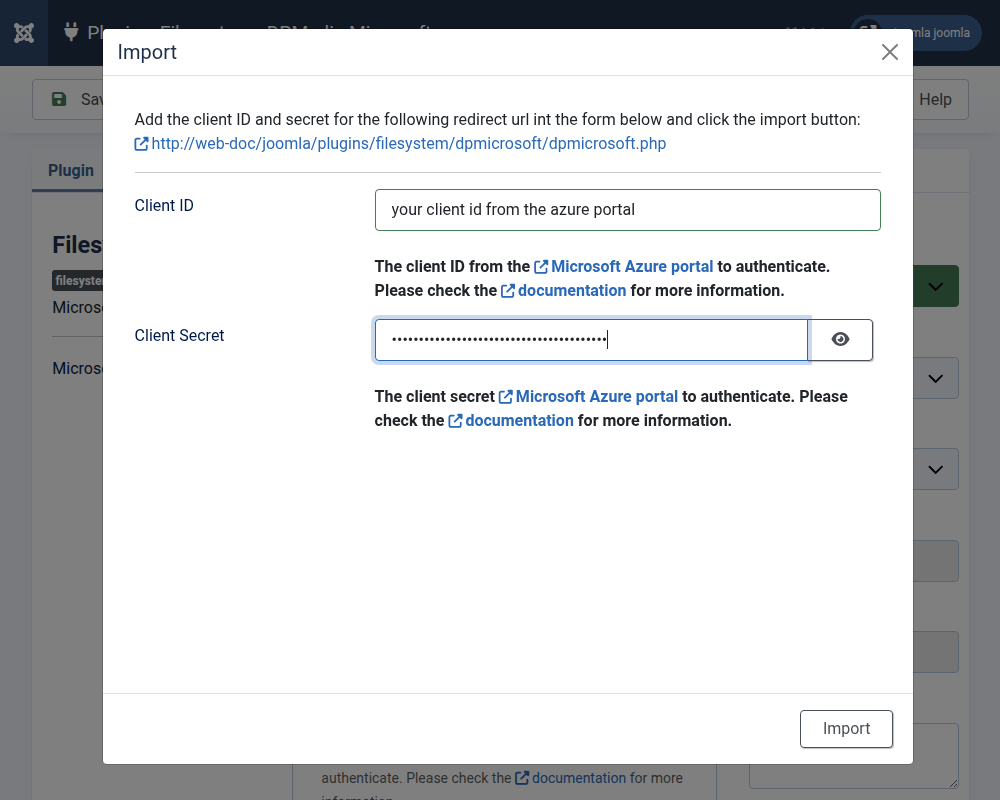 After you have setup the credentials in the Microsoft app console it's time to import it into Joomla.
