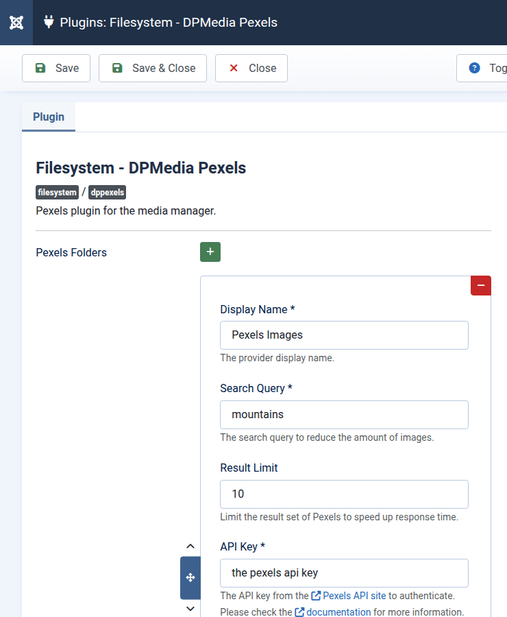 To do so, open the filesystem Pexels plugin in the plugin manager in the back end of your Joomla site. Click on the green "+" button in the plugin edit form. Copy the API key from the Pexels website into the form. Click the "Save" button in the toolbar of the plugin.
