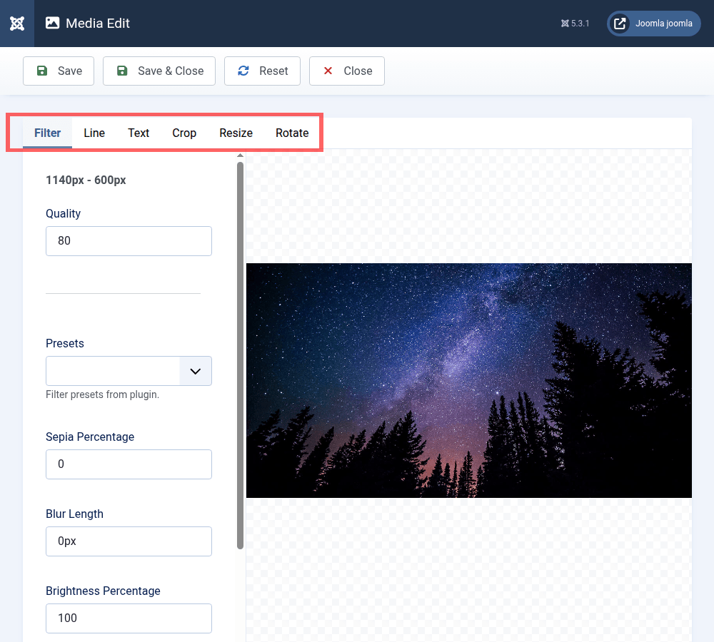 The media action plugins are adding image manipulation functionality while editing it in the Joomla media manager. When the editor edits an image, Joomla loads in the background the image editing plugins and displays each plugin and its options in a separate tab.