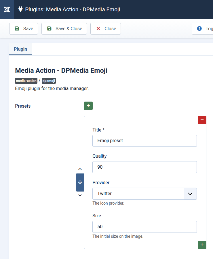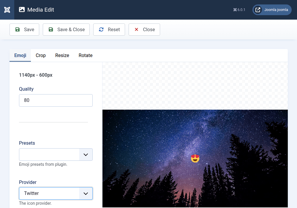 The "Emoji" plugin adds a possibility to drag and drop emojis into an image while editing it in the Joomla media manager. The emoji can be resized and positioned within the image after the drop is performed.